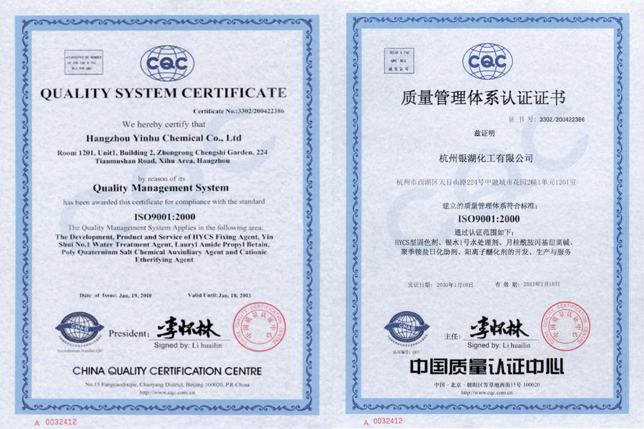 Company has been awarded the Quality System Certificate by reason of our Quality Management System for compliance with teh standard ISO 9001:2000 by the China Quality Centre (CQC) .